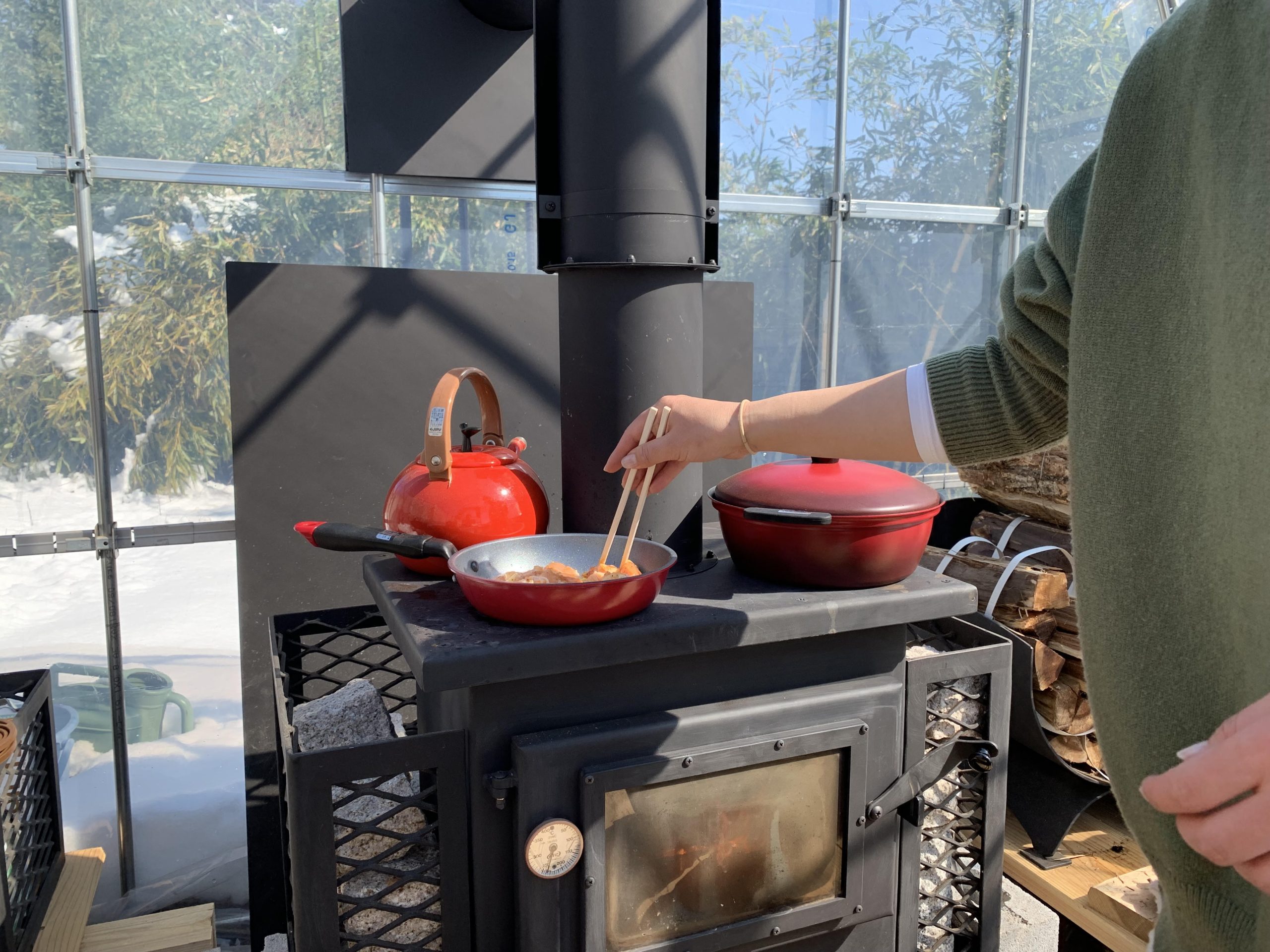 火を燃やす木材は自分達で割って、薪ストーブの温もりを感じながら美味しく料理を作る。。。